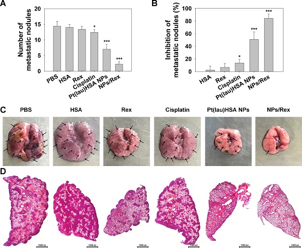 图六、Pt(lau)HSA NPs和NPs/Rex等组对抗肺癌转移的治疗效果