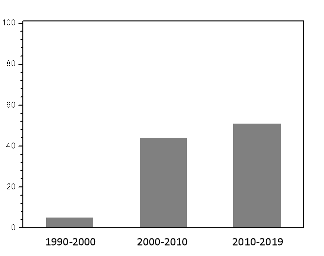 从图上可以看到,这100篇文章,有51篇分布在2010-2019年区间,有44篇分布在2000-2010年区间,5篇分布在1990-2000年。这个数据很能反映近二十年来,中国在材料领域研究的突飞猛进。相信,随着中国材料科学领域研究的进一步发展,未来还会有更多高影响力的工作产生。
