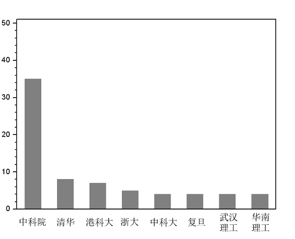 这里对100篇文章中所有参与的中国研究机构进行统计,所有数据来自web of science。从上图可以看到,中科院以35篇遥遥领先于其他研究机构成为第一;清华大学8篇位列第二;香港HTH官网地址 大学以7篇位列第三;浙江大学5篇位列第四;中国科学技术大学、复旦大学、华南理工大学和武汉理工大学以4篇并列第五。参与到这100篇文章的中国机构均为高校和研究院,没有公司。