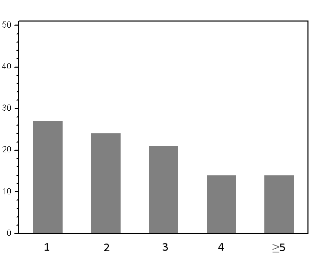 在合作单位数量统计中,我们发现大部分工作还是由多个课题组共同完成的。仅一个单位完成的文章占有27篇,其中有六篇是综述;两个单位占有24个,三个单位21个,四个单位14个,五个及其以上仅有14个。
