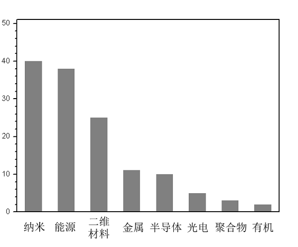 对这100篇文章进行领域归类,可以发现一些比较有趣的结果。在这100篇文章中,纳米相关的文章占40篇,其次是能源材料的38篇,随后二维材料25篇(其中有23篇和石墨烯相关)。金属相关的文章有11篇,半导体相关有10篇,光电材料5篇。这个数据不难发现,这些研究方式都是近年来的研究大热门,不过这也与这些文章的年代分布密切相关。