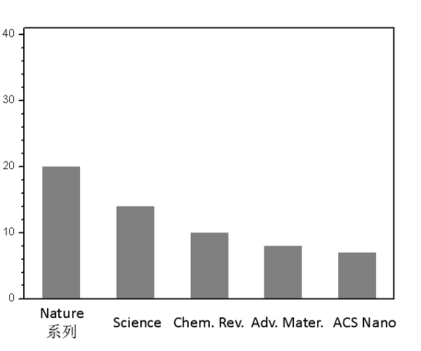 由于这100篇文章的期刊分布十分分散,我们这里仅统计排在前五的期刊情况。从图上可以看到,Nature及其子刊因为贡献20篇文章而位列第一(其中Nature8篇,Nature子刊12篇);Science因为贡献14篇而位列第二;Chemical Reviews以10篇位列第三;排在第四的是贡献了8篇的Advanced Materials;ACS Nano凭借7篇排在第五。这100篇文章基本上都属于主流期刊。
