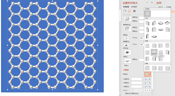 选中正六边形的组合7,三维旋转,棱台全部为4磅,金属材质。