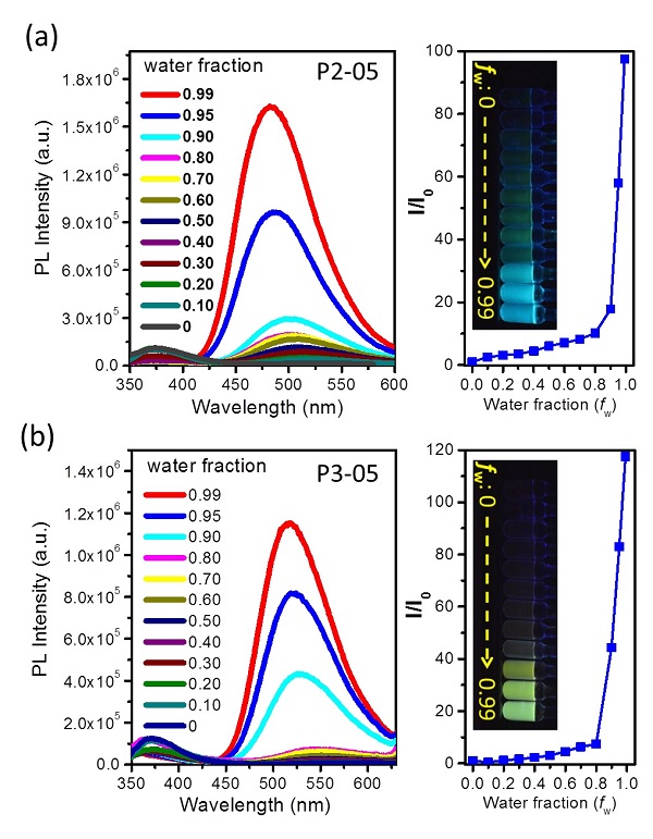 在THF/水混合溶剂(10-5 mol·L-1)中的P2-05(a)和P3-05(b)的PL光谱和相对发射强度,插图为紫外光下具有不同水分含量(fw)的发光图像。