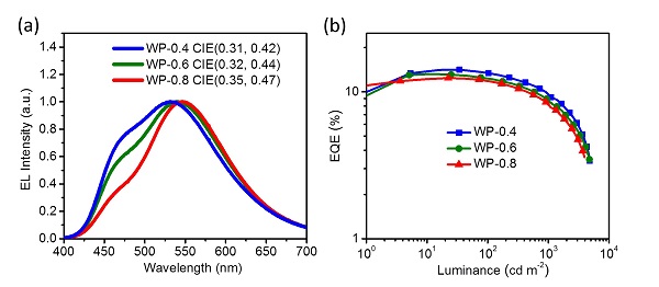 基于白光空间电荷转移高分子的溶液加工型OLED器件的EL光谱(a)和EQE-亮度曲线(b)。