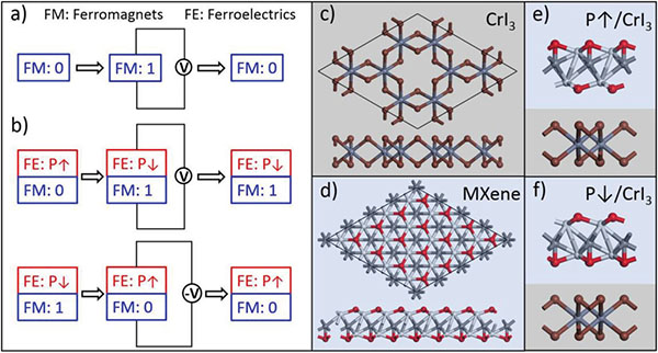 (a,b)原子厚CrI3/Sc2CO2多铁存储器模型。数据写入取决于铁电Sc2CO2,数据读取是基于铁磁CrI3与铁电Sc2CO2的极化态P↓(a)和P↑(b)之间的耦合所引起的不同电信号或光信号。