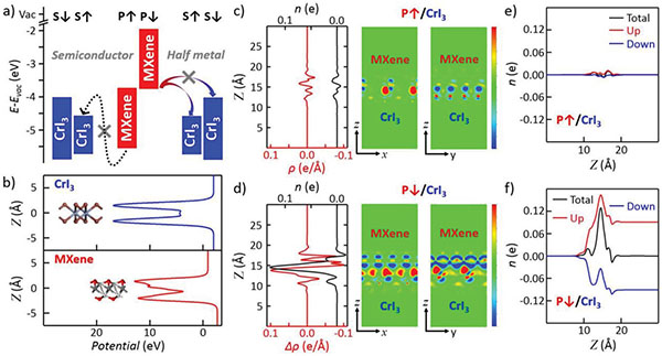 (e,f)CrI3和P↑(e)与P↓(f)Sc2CO2组成的异质结构。