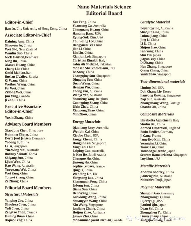 NMS聘请了来自中国、美国、英国、加拿大、新加坡、日本、俄罗斯、丹麦、澳大利亚、法国、德国等19个国家129名顶尖学者组建编委团队,其中包括16位院士:结构材料领域专家吕坚院士、方岱宁院士、郭万林院士、张统一院士、魏悦广院士,纳米力学专家杨卫院士,纳米表面技术领域专家高唯院士,金属材料领域专家Ruslan Z Valiev院士、Niels Hansen院士、Dorte Juul Jensen院士,结构复合材料领域专家Yiu-Wing Mai院士,高分子材料领域专家王琪院士,无机非金属领域专家周济院士,碳纳米材料专家成会明院士,石墨烯领域专家Rodney S Ruoff教授,材料科学晶体结构专家张泽院士等。