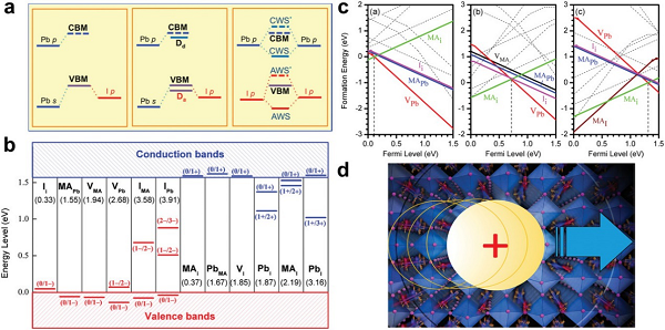 (a)在铅卤化物钙钛矿中CBM和CBM缺陷形成示意图(左),阳离子和阴离子形成的施主和受主缺陷示意图(中),阳离子-阳离子和阴离子-阴离子误成键的缺陷示意图(右)。