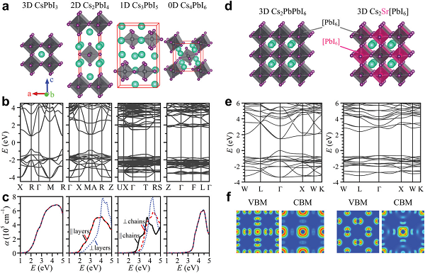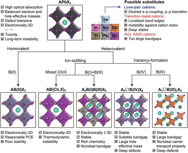 Pb的替换按照价态可分为两类:(i)同价替换(比如Sn(II)、Ge(II)等);(ii)异价替换(比如Bi(III)、Sb(III)等)。同价元素替换可以保持三维钙钛矿结构,但稳定性欠佳。对于异价元素替换,为保持电中性条件,可以采取两种替换方式。一种是“离子劈裂”,即通过将Pb(II)劈裂成一价和三价阳离子的组合形成双钙钛矿结构,或在单一异价阳离子替换Pb(II)的同时引入混合价态阴离子。阳离子的劈裂虽然保持三维晶体结构,但通常因其降低的电子维度而表现出欠佳的光电性能;阴离子劈裂能得到类似铅基钙钛矿的优异性能,但在实验上难以合成。另一种则是通过形成空位来维持电中性条件。然而空位的形成将原有的三维钙钛矿结构“切割”成了低维度的晶体结构,从而降低电子维度,“毁灭”了铅基钙钛矿原有的优异光电性能。