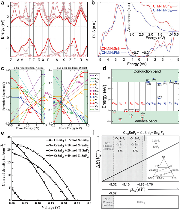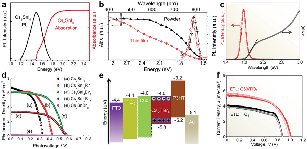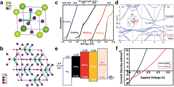 (f)用CsGeI3和MAGeI3制造的光伏器件的J-V曲线