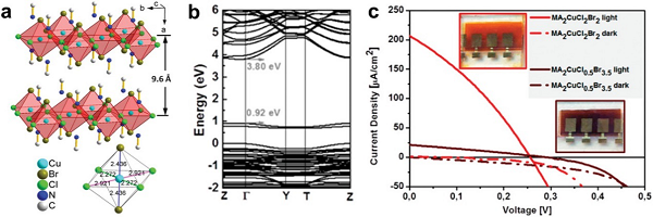 (c)用MA2CuCl2Br2和MA2CuCl0.5Br3.5制造的太阳能电池的I-V曲线。