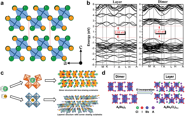 (d)从A3Sb2X9的零维二聚体到A3Sb2ClxI9-x层状相的Cl加成诱导转化示意图。