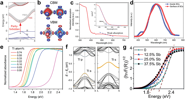 (ii)以无毒的异价元素In(I)、Sb(III)和Bi(III)和同价元素Ge(II)、Sn(II)等替代Pb可以维持孤对s电子和非活性p轨道的电子特性。In(I)由于高能量的5s轨道导致其极不稳定;Sb(III)和Bi(III)则会导致钙钛矿具有低维结构或低电子维度,这极大地限制了基于它们制作的太阳能电池的性能。但是,这些化合物在光电探测器和发光器件等其他应用中极具潜力。