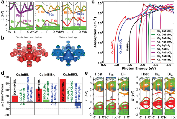 (b)A2B(I)B(III)X6 (B(I)=Tl, In; B(III)= Bi, Sb)的CBM(红色)和VBM(蓝色)处的典型电子波函数示意图。