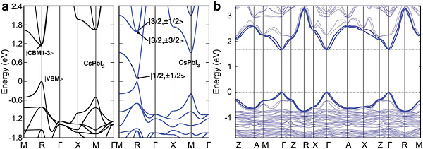 (a)LDA计算的立方CsPbI3钙钛矿的能带结构示意图。