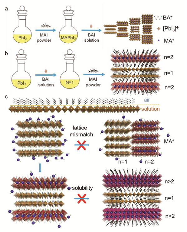 (c)(BA)2PbI4/(BA)2(MA)Pb2I7异质结构的设计生长机制示意图。