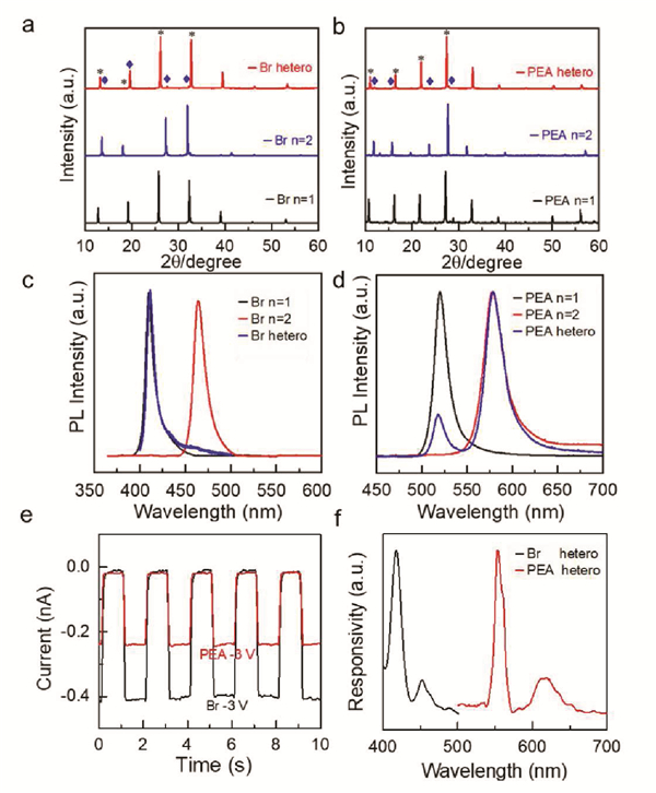 不同层数的2 D钙钛矿由于层状结构的特性,在形成异质结时无需考虑晶格匹配,是制作异质结器件的理想材料。在之前的工作中,作者通过溶液和气固相插层联合的方法,制备了大尺寸二维钙钛矿的水平和垂直异质结结构。然而,该方法只能获得结晶质量相对较差的多晶体的异质结构,进而导致它们的光电探测器性能不佳。因此,大规模、可控的合成高结晶的二维钙钛矿异质结构对于提高光电器件的性能十分重要。窄光谱响应的光电探测器在生物医学传感、成像、防御和机器视觉领域具有重要的应用。迄今为止,窄带光电探测器是通过(1)将宽带光电探测器与带通滤波器相结合来实现;(2)有意设计窄带波段有源吸收材料;(3)采用等离子体效应来增强特定波长范围内的吸收;(4)操纵光生载流子收集效率。虽然上述策略可以获得窄带光电探测器,但是窄带双频光电探测器的研究仍处于起步阶段。本文报告了一种合成(C4H9NH3)2PbI4/(C4H9NH3)2(CH3NH3)Pb2I7窄带结异质结构的方法,可获得厘米尺寸、可控厚度、可控结深度、高结晶质量的二维钙钛矿异质结,并基于异质结制作了窄带双频稳定性光电探测器。
