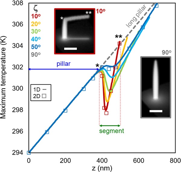 综上所述,作者通过互补实验、模型和模拟确定光束诱导的加热,探究了使用聚焦电子束诱导沉积(FEBID)对网格物体3D纳米打印期间的沉积速率影响。使用FEBID进行3D纳米打印的精度取决于沉积结构复制原始数字设计的程度。目前,需要经验校正来补偿沉积期间的纳米线变形和弯曲,这限制了纳米级精度。在纳米线生长期间,电子束相互作用驱动沉积也引起局部加热。随着纳米线生长的热阻增加,束撞击区域的温度逐渐升高,导致沉积速率随之降低,纳米线朝向基板弯曲,实验、数学模型和模拟均证实了上述结果。
