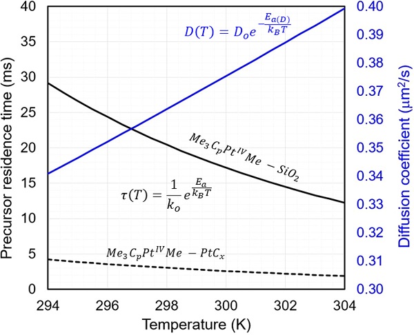 前驱体表面停留时间τ和扩散系数随温度的变化。
