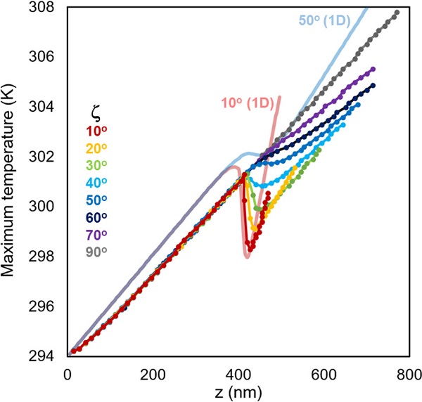 通过1D分析数学模型(实线)预测沉积物的最高温度作为沿z坐标的总沉积高度的函数。