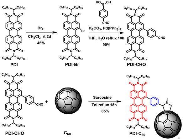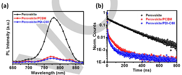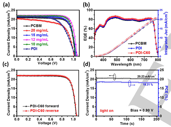 有机-无机杂化钙钛矿太阳能电池因其高的光电转换效率及简单廉价的制备工艺,在光伏领域掀起了新的研究热潮,是当前发展最快的新一代薄膜光伏器件。经过近十年的研究发展,钙钛矿太阳能电池的光电转换效率已经从3.8% 跃升至目前的最新认证效率24.2%,与商业化的晶硅太阳能电池相当。以器件结构分类,钙钛矿电池可分为正式结构 (n-i-p)和反式结构 (p-i-n),与前者相比,反式结构器件因制备工艺简单、可低温成膜、无明显迟滞效应等优点受到越来越多的关注。PCBM因其优异的电子迁移率、与钙钛矿匹配的能级结构、能有效钝化钙钛矿缺陷以及可低温溶液制备等优势,已广泛使用作为反式钙钛矿器件的电子传输层,然而其光化学不稳定性限制了器件效率及稳定性的进一步发展。已有研究报道π-共轭有机材料−苝二酰亚胺 (PDI) 具有较高的导电性和迁移率,同时可以隔离钙钛矿薄膜、钝化表面缺陷并防止钙钛矿分解,然而基于PDI为电子传输层的电池效率却不如人意。因此实现PCBM和PDI优势的结合将有望实现反式钙钛矿电池效率和稳定性的进一步发展。