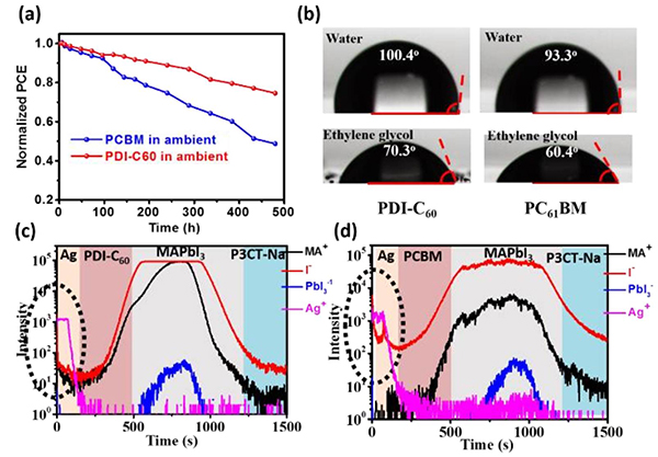 研究人员巧妙合成了PDI-C60作为反式钙钛矿电池的电子传输层,相比于PCBM,具有较浅的HOMO和LUMO值、更高的电子迁移率和更强的疏水性。基于PDI-C60为电子传输层的钙钛矿电池最高效率可达18.6%,同时PDI-C60对薄膜起到了很好的隔离作用,有效阻止了钙钛矿的分解,从而提高了器件的稳定性。该PDI-C60杂化策略为反式钙钛矿器件的高效电子传输层设计提供了新的研究思路。