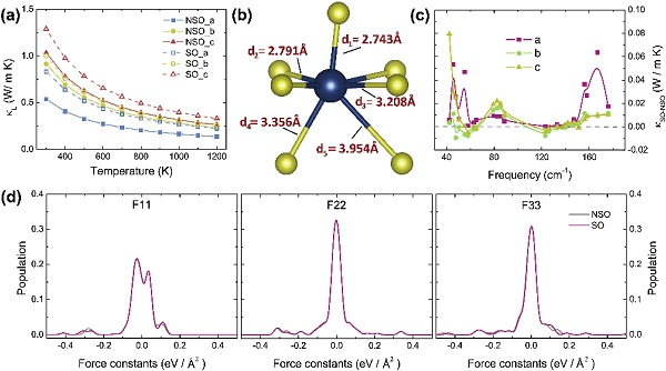 d) 考虑到自旋-轨道相互作用,总和非谐散射率(NSO-SO,红线)与晶格热导率变化(绿线)之间的表观相关性,还说明了在室温下用(浅黄色)和没有(青色)SOC效应的非谐散射率,每个声子分支的中值频率用作横坐标值以便更好地比较。