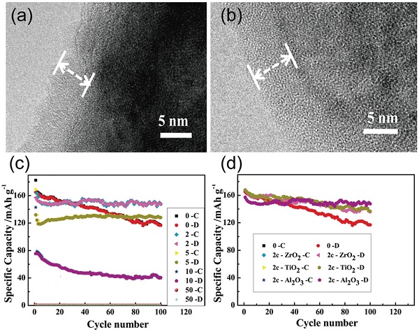 (a, b)通过50-ALD循环涂层的LiCoO2正极的HRTEM图像:(a)TiO2和(b)Al2O3;
