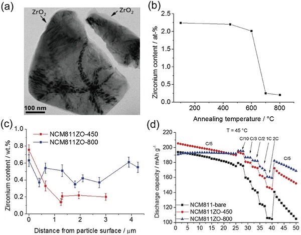 (c)对于NCM811ZO 450℃和NCM811ZO 800℃,Zr含量与颗粒表面到内部的距离之间的关系;