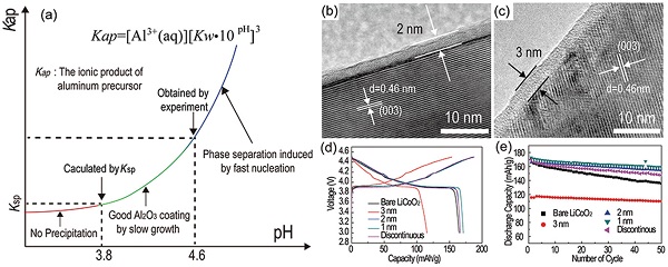 该团队研究人员致力于对锂离子电池正极材料进行表面修饰以改善其电化学性能。主要分为两部分工作,一部分是通过动力学调控来获得纳米精度的均匀包覆层。均匀、可控的包覆层为研究纳米材料的表界面特性及作用机理提供了良好的模型体系。然而金属离子在沉淀的过程中存在成核和生长的两种趋势,通常情况下,沉淀的快速成核过程容易形成分相的颗粒,难以得到均匀可控的包覆层。因此如何通过简单的液相沉淀在材料表面构筑分布均匀、厚度可控的金属氧化物包覆层在合成方法学上一直存在挑战。该课题组依据Lamer’s law中沉淀的成核及生长规律,利用特定pH值的缓冲溶液作为反应体系,控制沉淀的过程停留在以缓慢生长为主的阶段,得到了分布均匀、厚度可实现1 nm级精确调控的Al2O3包覆在LiCoO2表面(Angew. Chem. Int. Ed., 2014, 53, 12776)。除了包覆金属氧化物,针对不同的材料及应用场景,曹安民课题组通过调控沉淀的缓慢生长过程,实现了诸如碳、磷酸盐、硫化物等不同物种的均匀包覆,同时还验证了这些包覆方法在不同底物上的可行性。这些成果为包覆层作用机理的深入研究建立了良好的模型,丰富了材料表界面精确调控的方法,为材料的性能优化提供了更多地借鉴。相关的工作发表于ACS Applied Materials & Interfaces、Journal of Materials Chemistry A、Chemical Communications、Npg Asia Materials 等期刊。另一部分工作是表面固相反应构筑外延掺杂层提升正极材料稳定性。该部分工作也是建立在形成均匀包覆层的基础上,形成的包覆层在一定的煅烧温度下可以使得外来离子如Al3+进入到LiNi0.5Mn1.5O4表面晶格中的16c空位(Chem, 2018, 4, 1685-1695)。Zn2+进入到LiNi0.5Mn1.5O4的表面晶格中形成岩盐相稳定表面化学(Journal of the American Chemical Society, 2019.)利用此设计策略既可以避免包覆层不良的传质特性及充放电过程中由于其体积收缩和膨胀产生的碎片对电池性能的不良影响,又可以提高电极材料的稳定性。