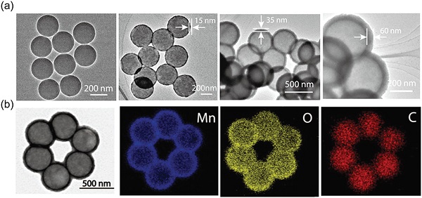 (A)裸PS(a)、不同的AlPO4厚度(b)40 nm、(c)10 nm和(d)90 nm的TEM图像;