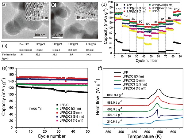 (a, b)原始LFP的TEM图像(a)LFP@C3(8.5 nm涂层)和(b)LFP@C4(16 nm涂层);