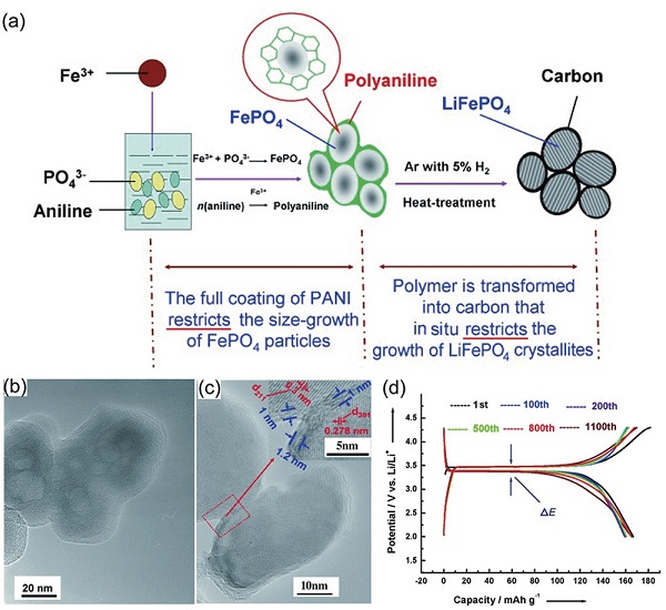 (c)LiFePO4 /碳一次颗粒的典型TEM图像;