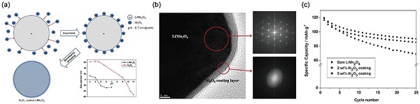 (a)通过静电吸引力将Al2O3涂覆在LiMn2O4表面的示意图以及Zeta电位分析;