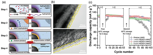 (a)PEDOT涂覆LNMO的制备过程示意图;
