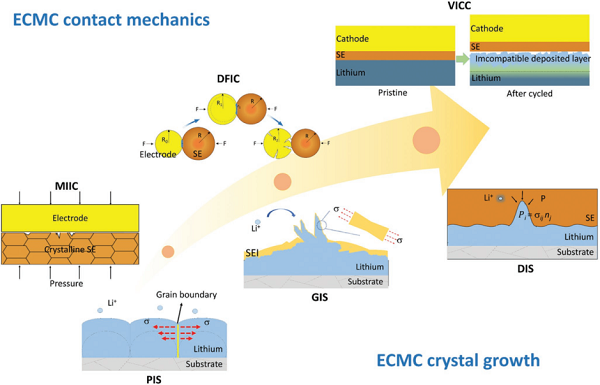 在该综述中,作者将固态锂金属电池中关键的界面问题分为了两种,即电极-电解质界面物理接触问题和界面锂沉积问题。在界面物理接触问题中,其关键问题主要有材料自身兼容性差异引起的接触问题(MIIC),电极材料变形断裂引起界面接触失效问题(DFIC)及电极材料体积变化引起的接触失效问题(VCIC)。而锂沉积的电-力-化耦合问题主要包括沉积诱导应力问题(PIS),枝晶生长引起SEI膜断裂问题(GIS)以及电极变形引起的界面应力问题(DIS)。