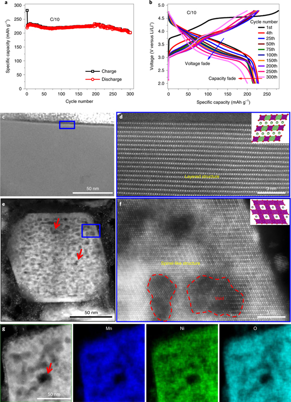 e,f,300次循环后的Li1.2Ni0.2Mn0.6O2正极颗粒的低倍和高倍STEM-HAADF图像(e中蓝色矩形标记的区域被放大并显示在f中),揭示了纳米孔洞的形成,插图给出了相变后的晶体结构模型(由e中的红色箭头表示),且晶格转变为尖晶石状结构(f)。
