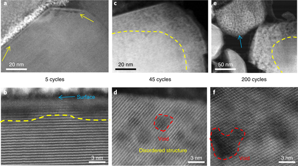 Li1.2Ni0.2Mn0.6O2正极的STEM-HAADF图像显示随着电池循环圈数的增加,纳米孔洞从颗粒表面朝向颗粒内部逐渐扩散。
