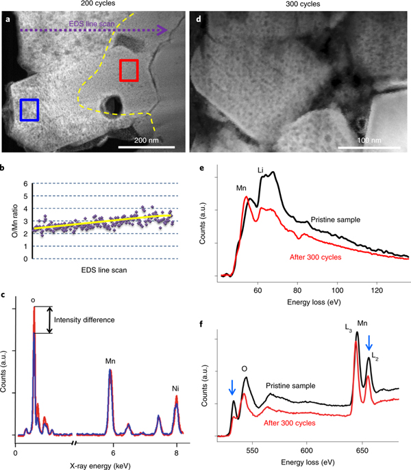 e,对比原始样品和300循环后样品的电子能量损失谱,发现300循环后Li K边强度降低,说明300次循环后样品中的Li浓度低于原始样品。