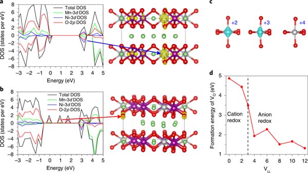d,氧空位的形成能与形成锂空位数量的关系曲线。d中的虚线表示阳离子氧化还原与阴离子氧化还原的分界线。紫色、银色、绿色和红色球分别代表Mn、Ni、Li和O原子。