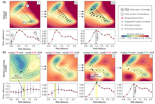 近日,美国斯坦福大学的Thomas Bligaard研究员(通讯作者)团队在Physical Review Letters上发表了题为“Low-Scaling Algorithm for Nudged Elastic Band Calculations Using a Surrogate Machine Learning Model”的文章。文章表明,在传统的微动弹性带(NEB)计算中整合入代理高斯过程回归的原子模型,可以有效增加收敛速度。在文中所用的代理模型方法中,弹性带收敛的时间不与路径中移动图像的数量成比例,可以大大提高过渡态搜索的效率和鲁棒性。和传统的NEB计算相比,该算法不对图像数量进行任何操控,而是通过构造一个具有高斯过程回归的概率本质的收敛标准,对所有图像结合目标模型势能中鞍点力的不确定性估算来达到收敛。这种方法从函数求值的角度来说,要比传统的NEB方法快一个数量级,且没有损失收敛能垒的准确性。