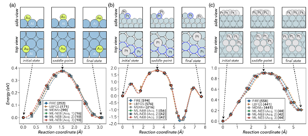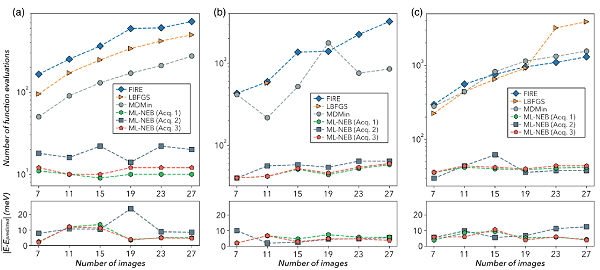 最小能量路径的计算分别由FIRE,LBFGS,MDMin和ML-NEB算法获得。每种算法收敛所需的的函数调用的数量如方括号内的加粗字体所示。