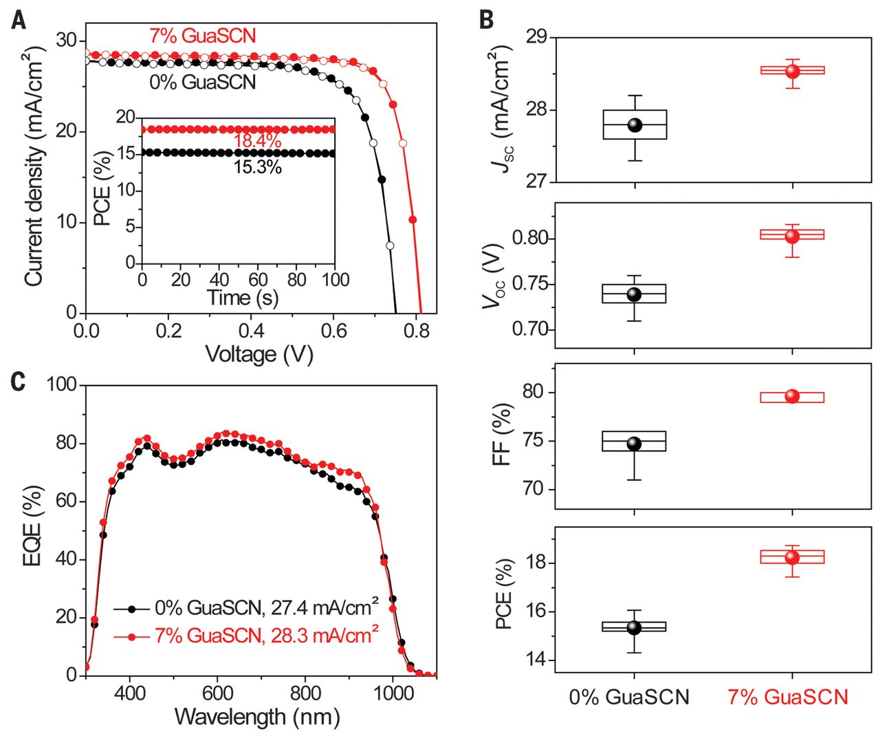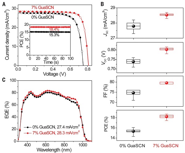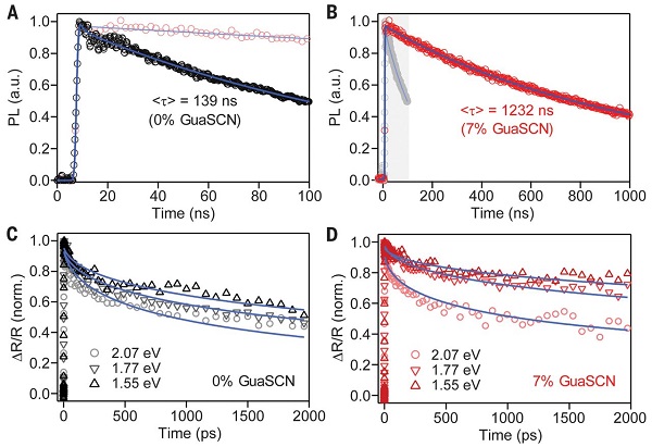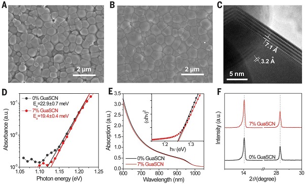 近期,美国托莱多大学的鄢炎发以及美国国家可再生能源实验室的Kai Zhu、J.J.Berry等人(共同通讯作者)等人发现硫氰酸胍(GuaSCN)这一材料的加入能够显著提升有机-无机低带隙(约为1.25eV)(FASnI3)0.6(MAPbI3)0.4钙钛矿薄膜的结构和光电性能。通过这一方法,器件缺陷密度被大大降低;载流子的寿命被提高到大于1微秒的水平;载流子扩散长度从500nm延伸到2.5微米;显著降低了表面重组速度;减少了薄膜结构缺陷。这些性能的改善不仅减少了能量失调的情况,还实现了效率大于20%的低带隙单结钙钛矿太阳能电池。当与宽带隙太阳能电池结合时,研究人员更是获得了效率分别高达25%的4端和23.1%的2端全钙钛矿型多晶薄膜串联太阳能电池。2019年05月03日,相关成果以题为“Carrier lifetimes of >1 μs in Sn-Pb perovskites enable efficient all-perovskite tandem solar cells”的文章在线发表在Science上。