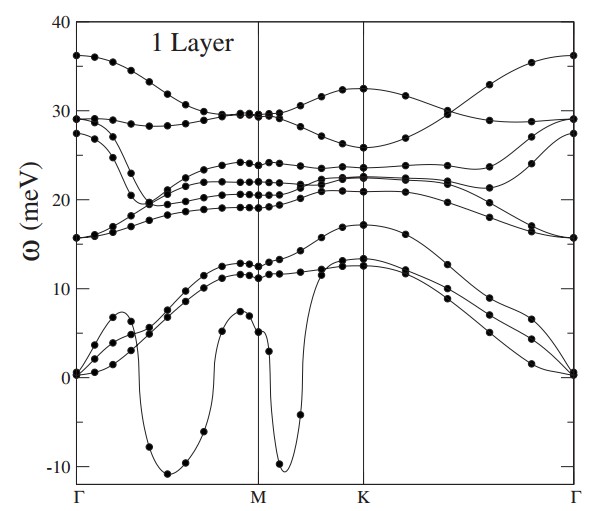 有些情况下,我们可以利用虚频信息使不稳定的材料变得稳定。如图2所示,单层2H-NbSe2声子谱的一条声学支存在虚频,主要位于Γ点和M点1/2处(对应倒格矢的1/4位置)。倒格矢的1/4,对应晶格长度的4倍。我们可能需要将原胞沿上述倒格矢方向扩大四倍,进一步优化原子位置,才可能得到比较稳定的晶胞。