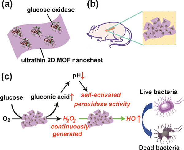 (c) 2D MOF/GOx杂化纳米催化剂作为良性、自激活级联试剂的抗菌机理。