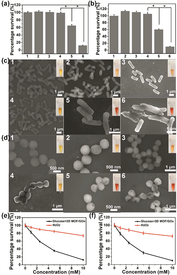 (e) 用不同浓度的H2O2或葡萄糖+ 2D MOF/GOx处理的大肠杆菌的存活率比较;