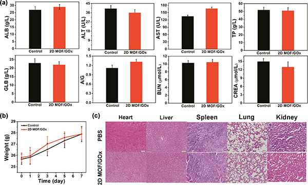 (a) 静脉注射2D MOF/GOx或作为对照的PBS时,健康小鼠的血液生化分析;