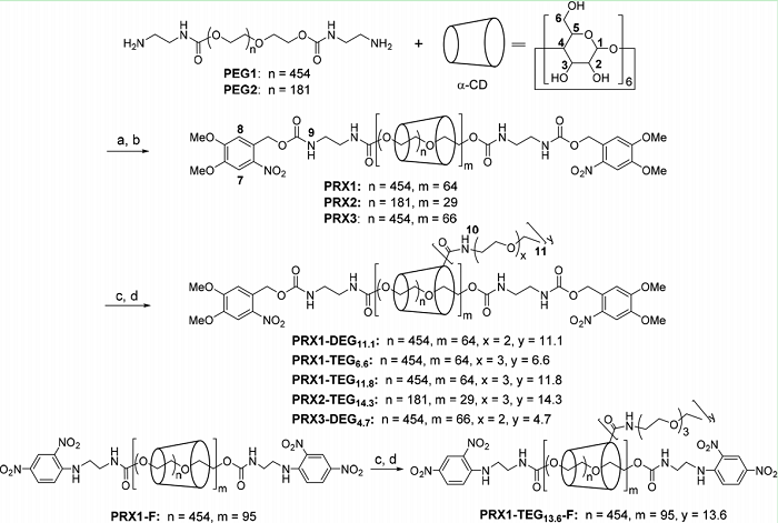 环糊精聚轮烷由于其合成简单,生物相容性好和易于官能化等特点,被广泛应用于生物医药领域。各类环糊精聚轮烷衍生物相继得以报道,特别地,甲基化环糊精聚轮烷具有特征的温度敏感行为,但其相变区间通常较宽,且回复滞后性明显。尽管已有报道采用寡聚烷氧醚修饰聚轮烷以调节其水溶性和细胞内化效率,但获得的PRX衍生物仍具有较宽的相变温度范围,滞后行为则鲜有研究。此外,聚轮烷拓扑结构对温度敏感行为的影响也尚不清楚。
