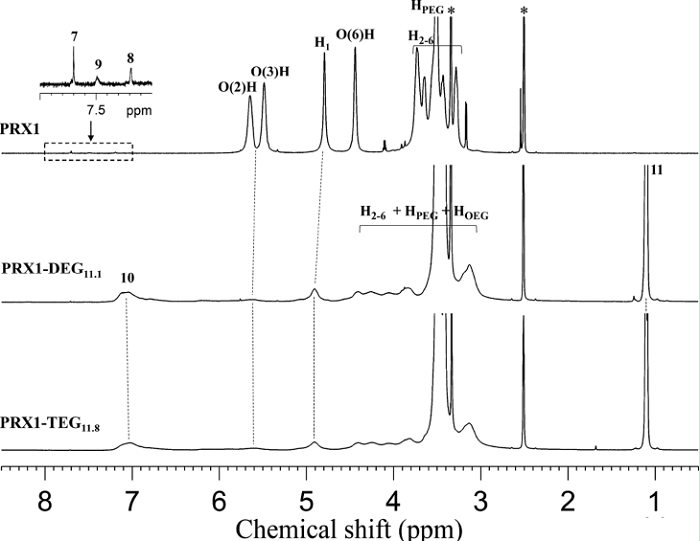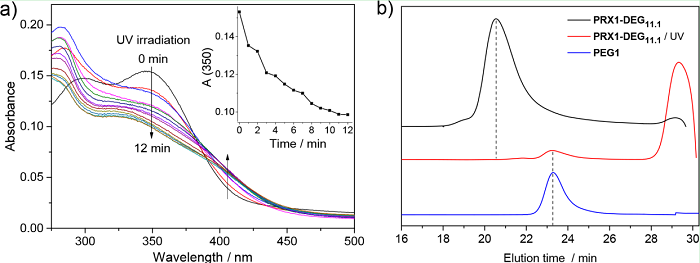 (b)PEG1和UV照射前后PRX1-DEG11.1的GPC曲线。洗脱液是DMF。